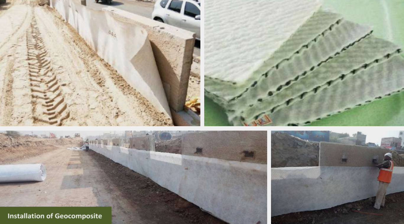 Application include but are not limited to sheet interceptor drain behind reinforced wall and reinforced steep slopes, land fill leachate transmission and collection, and use with multiple layered water proofing and roof deck drain system. We manufacture both 2D & 3D planner Geocomposites ranging thickness from 4mm to 10mm.